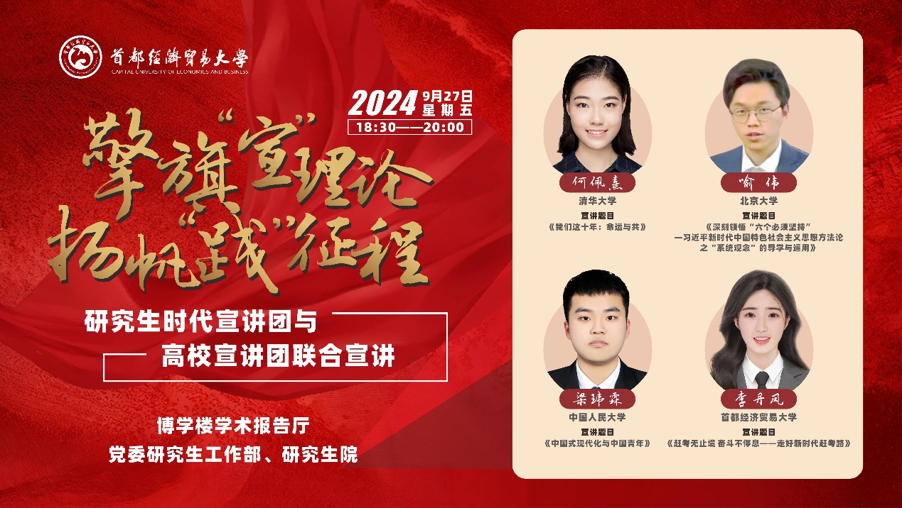 为庆祝新中国成立75周年,用“青言青语”讲好习近平新时代中国特色社会主义思想,加强高校宣讲团互联互建,我校研究生时代宣讲团计划于2024年9月27日举办“擎旗‘宣’理论,扬帆‘践’征程”高校联合宣讲会。请各学院积极推荐优秀学生干部参与高校联合宣讲会交流学习。具体安排如下: