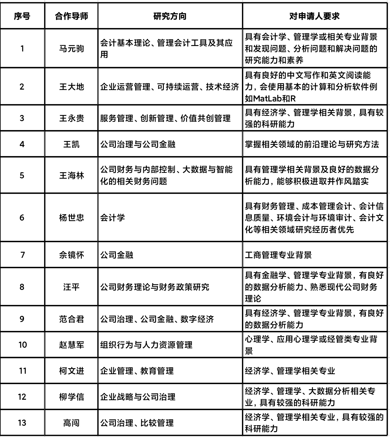 合作导师、招收方向及对申请人要求如下表所示(按导师姓氏笔画排序):
