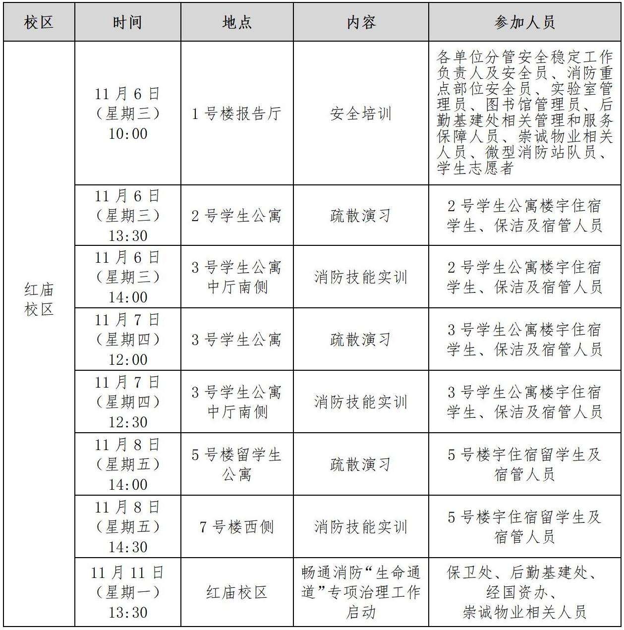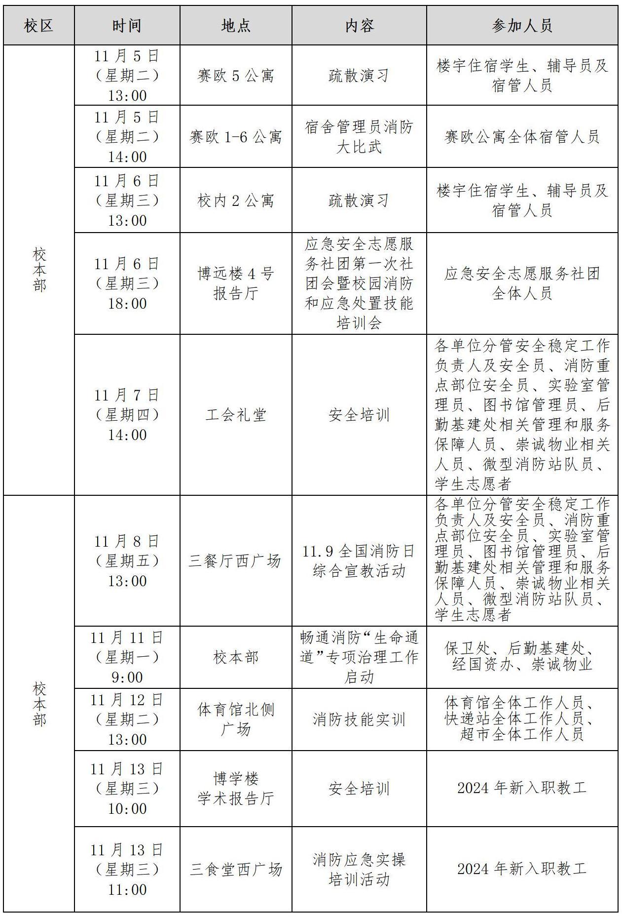 今年11月9日是我国第33个消防安全宣传日,主题是“全民消防· 生命至上”。为切实做好学校的消防安全工作,提高广大师生员工的消防安全意识和应对突发火情的自救技能,增强扑救初起火灾等应急处置能力,学校将在11月期间开展系列培训演练活动,具体通知如下: