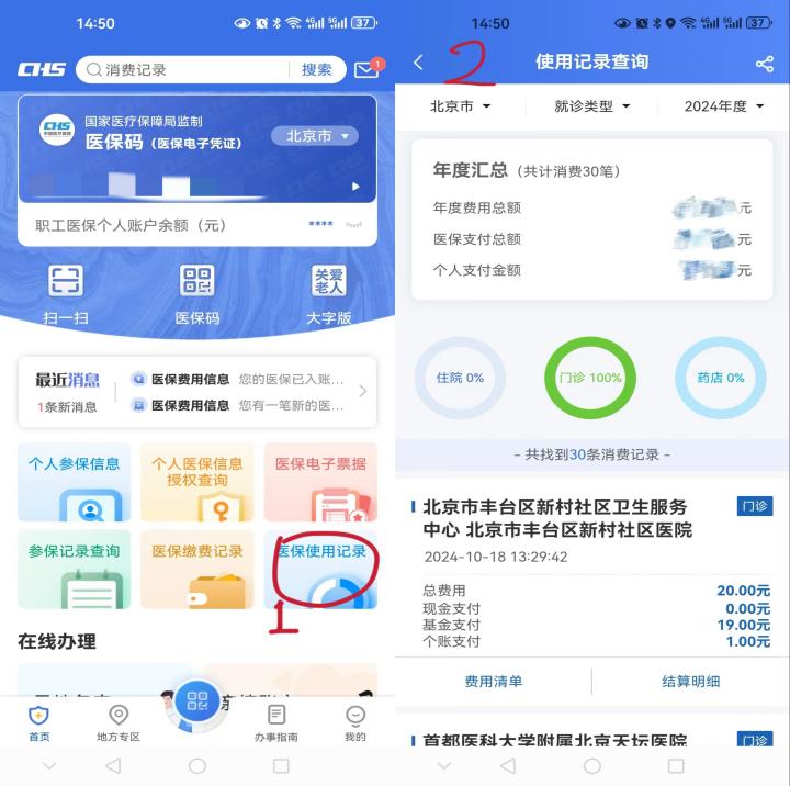 打开国家医保服务平台APP截图1,点击医保使用记录,截图2。如图所示: